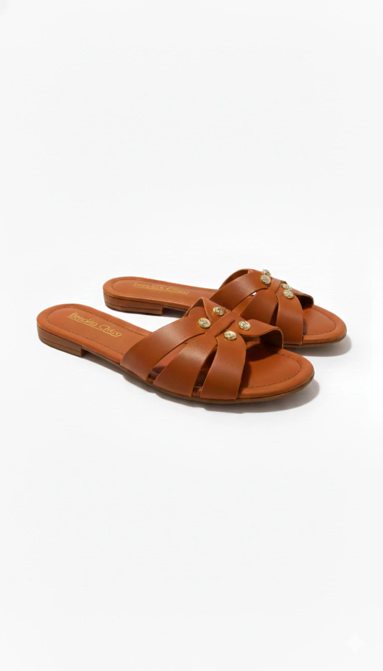 Rasteira feminina estilo chinelo, confeccionada em material sintético caramelo. Possui tiras largas cruzadas sobre o peito do pé, com aplicação de tachas douradas que proporcionam um charme especial ao modelo. O solado rasteiro garante conforto e praticidade, ideal para o uso diário. De calce fácil, sem fechamento, é perfeita para dias quentes e combinações casuais com vestidos, saias ou shorts.