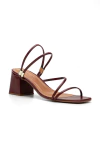 Descrição: Sandália com tiras finas no cabedal e calcanhar, adornadas com metais dourados delicados. Possui bico quadrado, salto bloco e calce fácil, sem fivela. Design leve, elegante e contemporâneo.