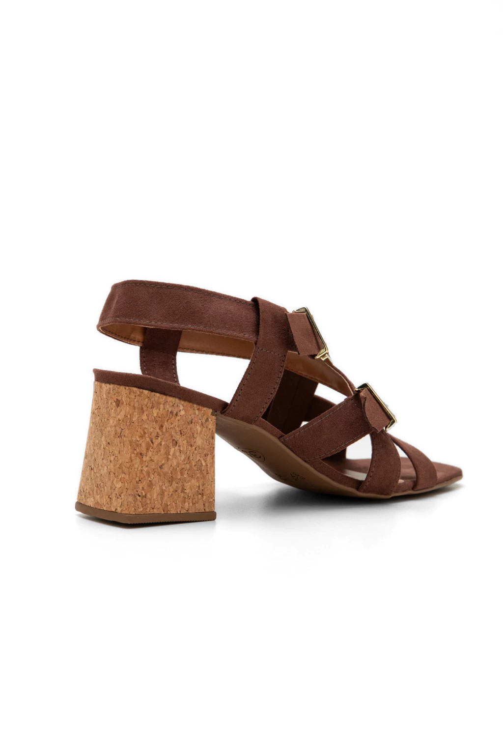Descrição: Sandália em tom neutro com acabamento tipo camurça. Possui tiras largas com duas fivelas metálicas frontais e salto bloco em cortiça. Bico quadrado. Um modelo marcante, confortável e versátil.