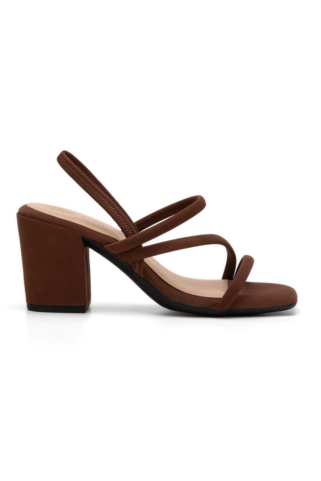 Descrição: Sandália marrom com acabamento fosco, tiras finas e elástico traseiro para ajuste. Modelo com salto bloco, bico arredondado e design minimalista. Um essencial contemporâneo e atemporal.