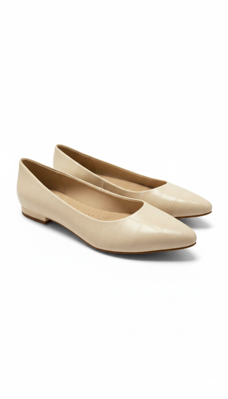 Sapatilha feminina de bico fino confeccionada em material sintético nude com textura croco. Possui palmilha acolchoada que oferece conforto extra ao caminhar e solado baixo, ideal para o uso prolongado.