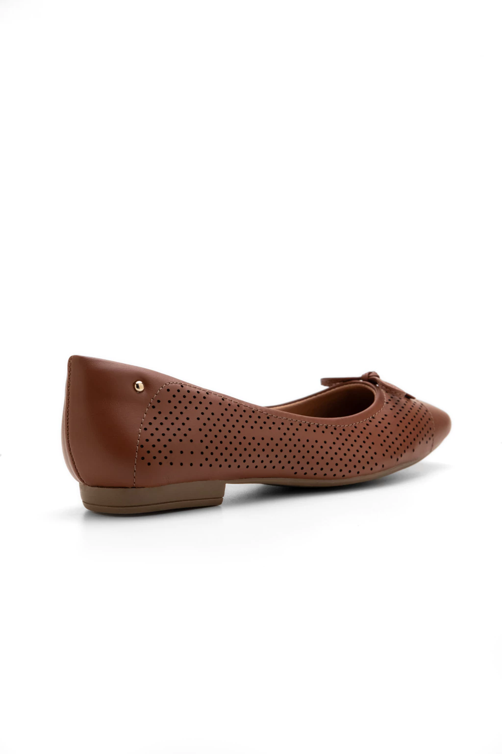 Bailarina com bico arredondado, cabedal perfurado e ponteira lisa. O modelo conta com laço decorativo no cabedal e solado baixo, oferecendo praticidade e elegância para o uso diário.
